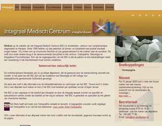 Integraal Medisch Centrum (IMC) te Amsterdam, centrum voor complementaire diagnostiek en therapie. Sinds 1989 hebben wij vele patienten uit binnen- en buitenland met positief resultaat mogen helpen. Wij richten ons op chronische klachten en zijn gespecialiseerd in het zoeken naar de oorzaken. Dit vindt zich onder andere terug in de samenwerkende disciplines in het centrum: Osteopathie, Mesologie en Integratieve Psychotherapie. Eén van de uitgangspunten van het IMC is dat de patient na drie behandelingen reeds een verandering in het klachtenbeeld moet kunnen ontdekken.